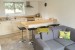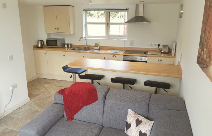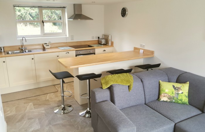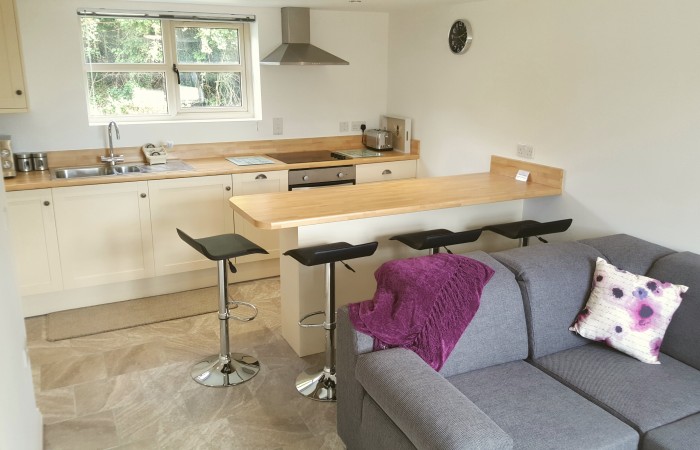 Downstairs comprises an open-plan living area with a fully-fitted kitchen and breakfast bar which seats up to four people. The kitchen also includes an oven, electric hob, microwave and dishwasher, as well as a washer-dryer and a fridge. The living area consists of a four-seater sofa with TV and DVD player.